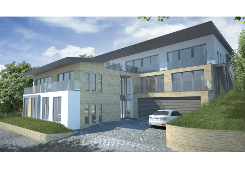 A local growing family wanted a house that would suit their needs into the future in the small coastal town that they have lived. A large modern house was designed clad in a local stone and sat into the hillside to minimise the impact of the new development on the local environment as can be seen in the photomontage.
